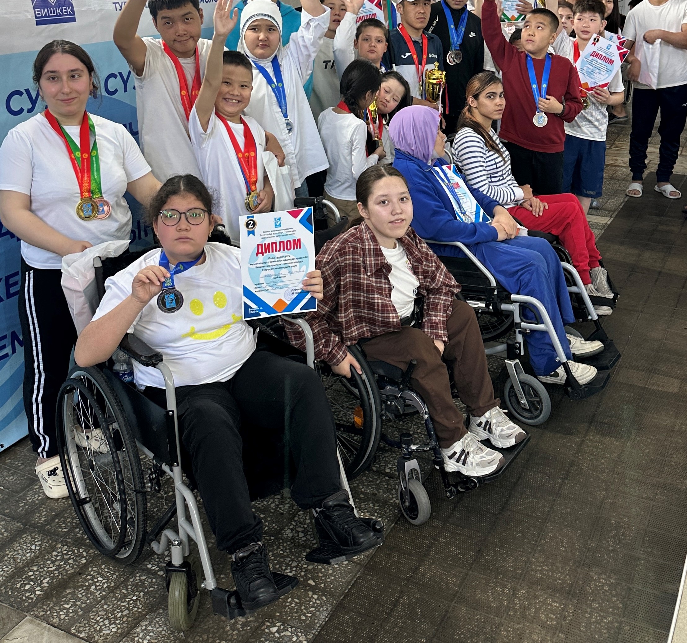 20 апреля 2025 года в городе Бишкек, в бассейне «Парус» (м-н Джал), состоялись соревнования по плаванию среди школьников с ограниченными возможностями здоровья, приуроченные к 80-летию Победы в Великой Отечественной войне. В мероприятии приняли участие более 60 детей из различных клубов и спортивных школ: СДЮШОР «Ынтымак», СДЮШОР «Дельфин», Федерация пара-триатлона, спортивные клубы «Парус» и «Радуга». Участниками соревнований стали дети: с нарушением зрения (полная или частичная потеря зрения); с нарушением слуха (полная или частичная потеря слуха); с нарушением опорно-двигательного аппарата и другими ограничениями здоровья; с лёгкими интеллектуальными нарушениями (в том числе с синдромом Дауна).