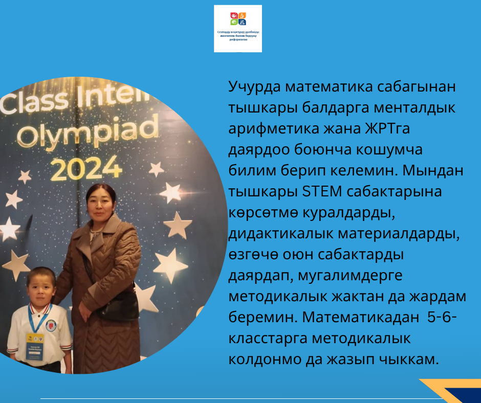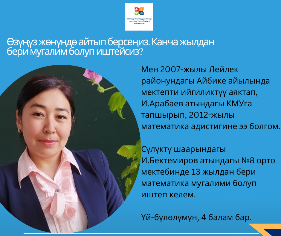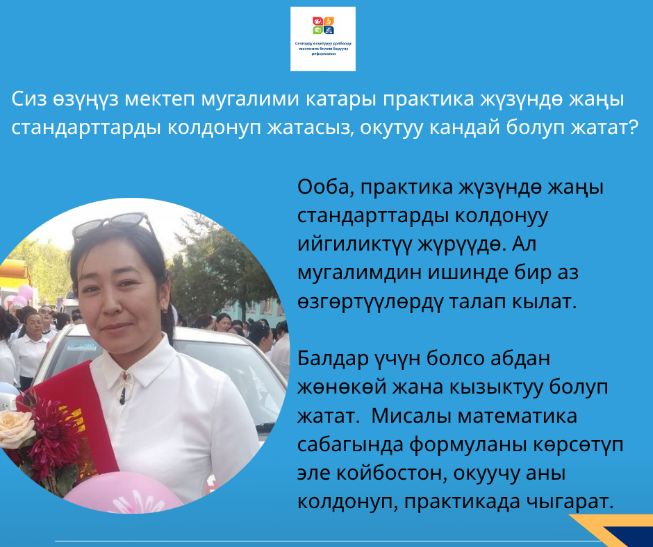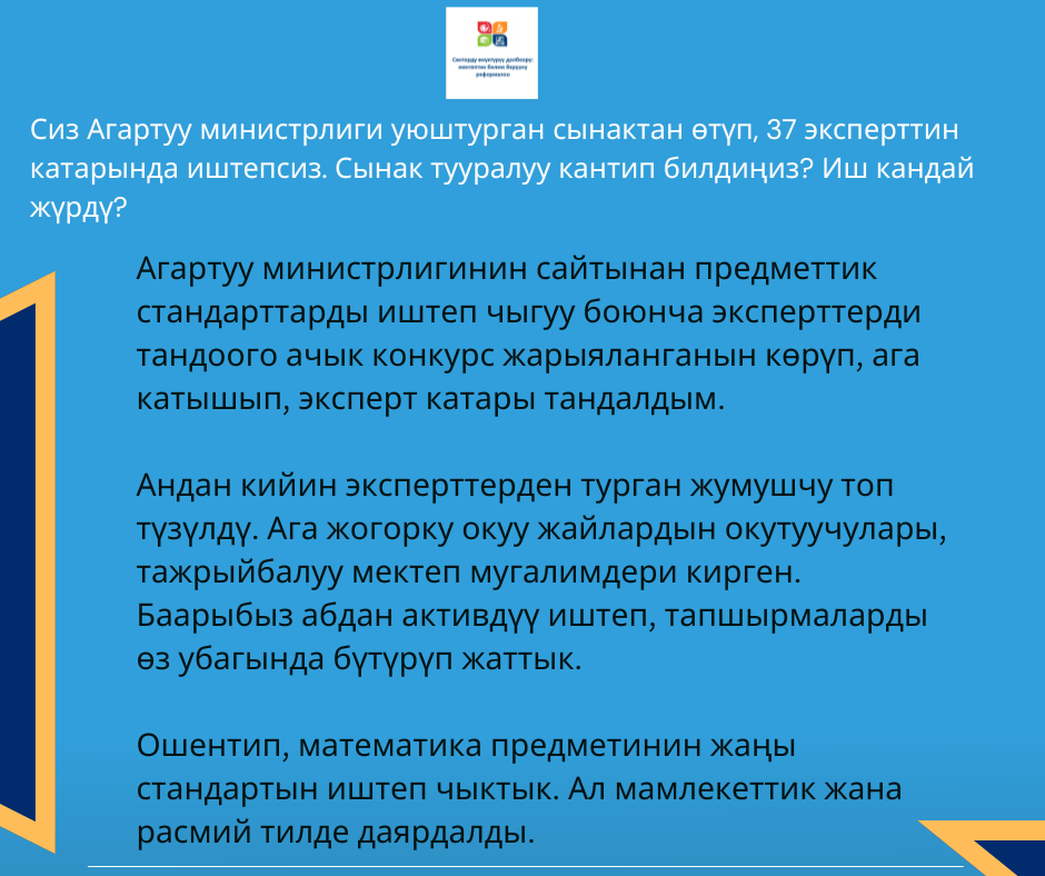 Алардын арасында Баткен облусунун Сүлүктү шаарындагы И.Бектемиров атындагы №8 орто мектебинде математика мугалими болуп эмгектенген Толгонай Мамытова да бар. Ал математика предмети боюнча предметтик стандартты иштеп чыгууга катышкан.