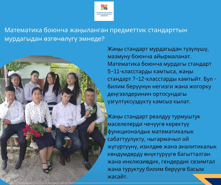Предметтик стандарттарды жаңылоо Агартуу министрлигинин «Секторду өнүктүрүү долбоору: мектептик билим берүүнү реформалоо» долбоорунун колдоосунда жүргөн.