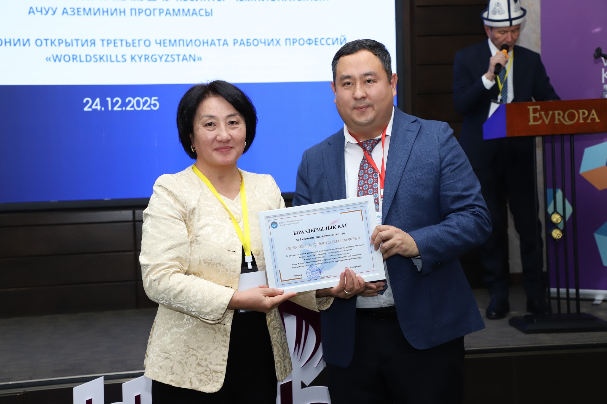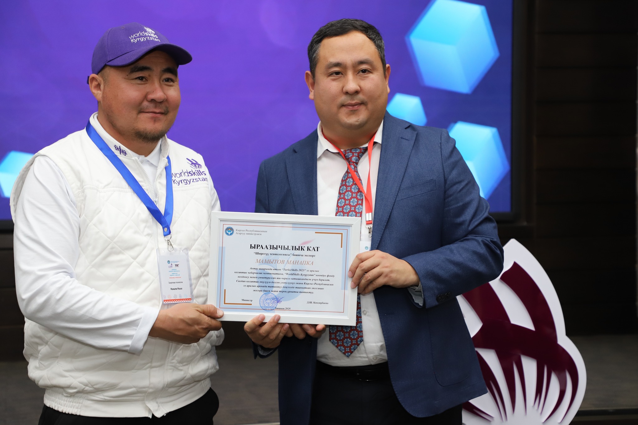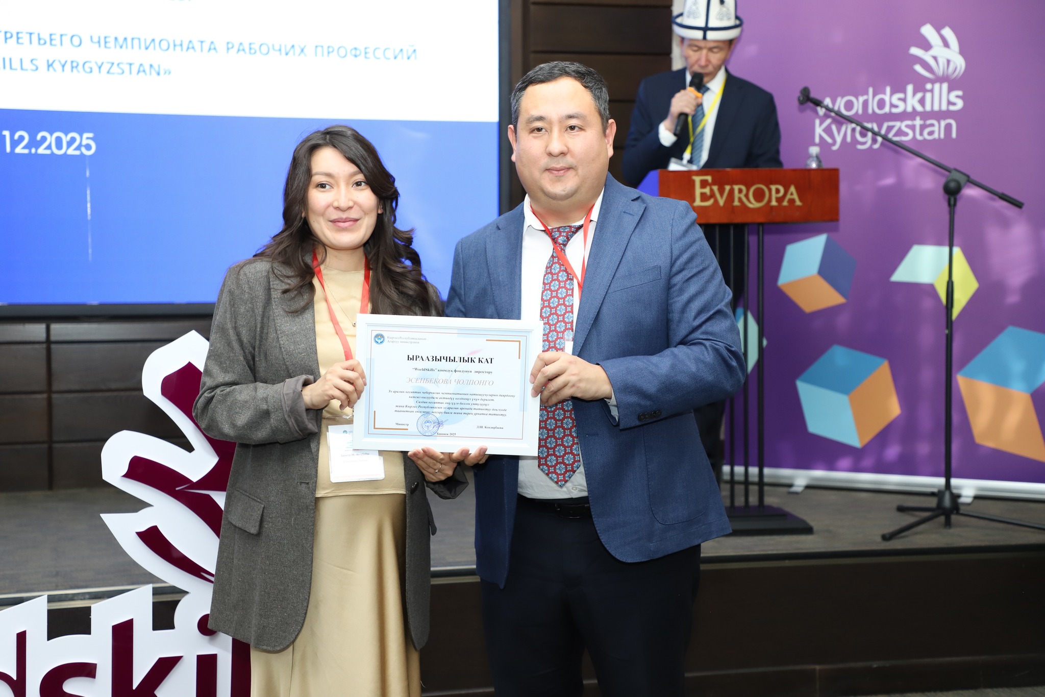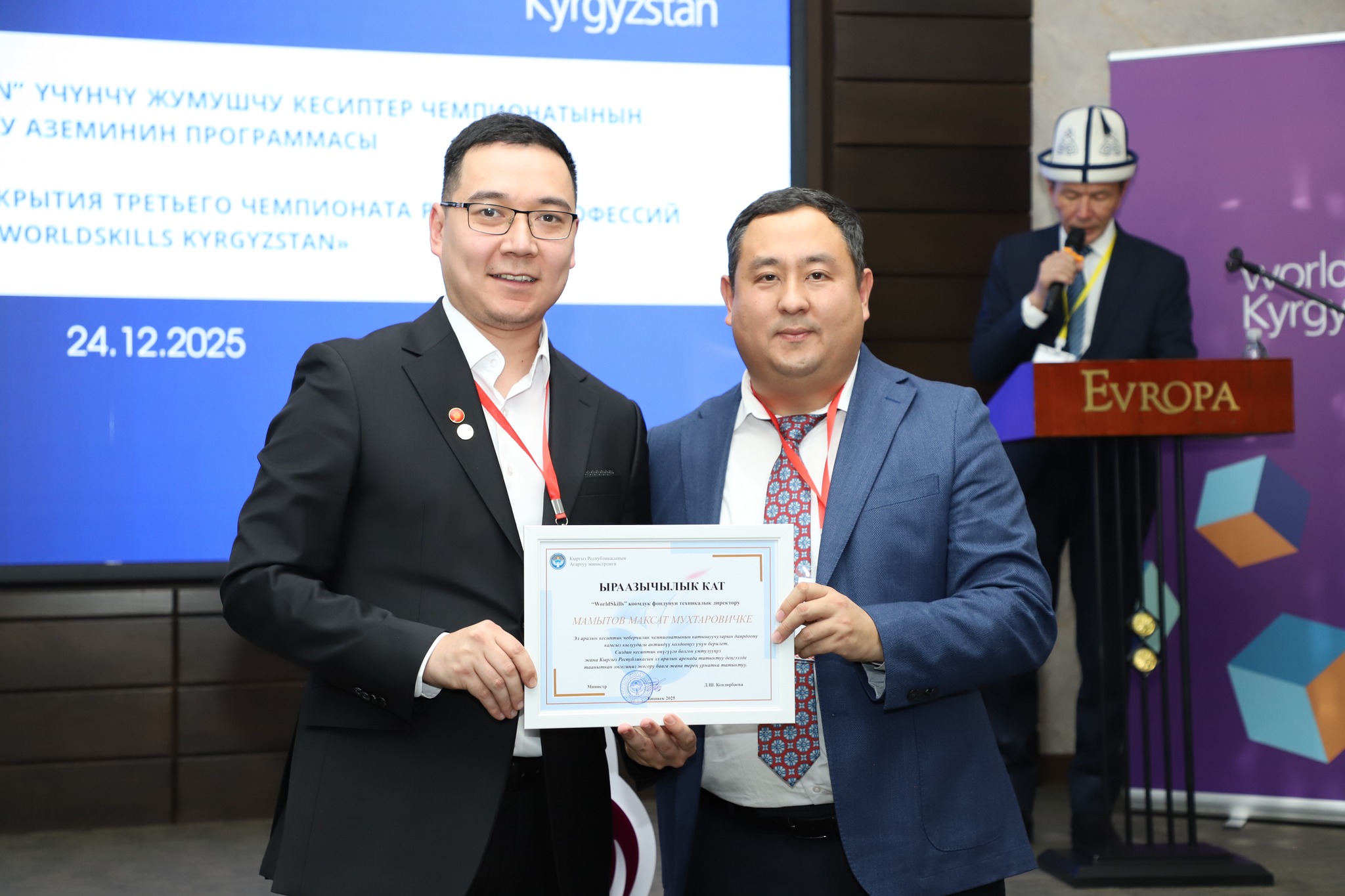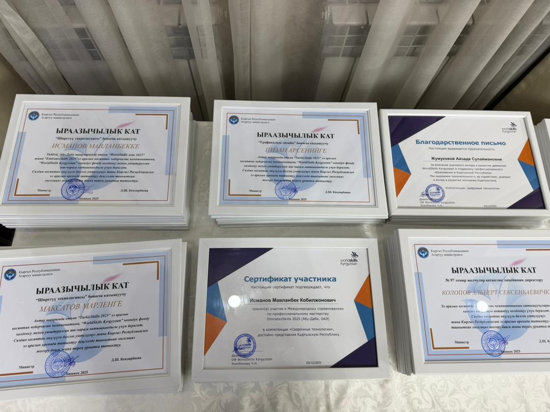 2025-жылдын 24-декабрында Бишкек шаарында жумушчу кесиптеринин үчүнчү улуттук «WorldSkills Kyrgyzstan» чемпионатынын салтанаттуу ачылыш аземи болуп өттү. Ачылыш аземде сөз сүйлөгөн Кыргыз Республикасынын Агартуу министринин орун басары Альберт Махметкулов быйыл кесиптик лицейлердин окуучулары бир катар эл аралык мелдештерге катышып, жогорку жетишкендиктерди көрсөткөнүн белгиледи. Анын айтымында, Тайбэй шаарында өткөн WorldSkills Asia Taipei 2025 эл аралык чемпионатында «Ширетүү технологиясы» компетенциясы боюнча №28 кыргыз-орус кесиптик лицейинин бүтүрүүчүсү Мавланбек Исманов Кыргызстанды татыктуу деңгээлде таанытып, «Best of Nation» наамын алган. Ошондой эле ал Кыргыз Республикасынын WorldSkills курама командасы алдыда Кытай Эл Республикасында өтө турган WorldSkills Shanghai 2026 эл аралык чемпионатына катыша турганын маалымдады. «Эл аралык кесиптик компетенциялык сынактарга катышуу бүгүнкү күндө кадрларды даярдоонун заманбап стандарттарын киргизүүгө, кесиптик көндүмдөрдү өнүктүрүүгө, эл аралык кызматташтыкты кеңейтүүгө жана жаштар арасында жумушчу кесиптерге болгон кызыгууну арттырууга өбөлгө түзөт», — деди Альберт Махметкулов. Мындан сырткары министрдин орун басары "WorldSkills Кыргызстан" коомдук фондуна, аталган кыймылды колдоп, кесиптик компетенцияларды өнүктүрүүгө көмөк көрсөткөн, мелдештерди уюштурган жана эл аралык аянтчаларга катышууга мүмкүнчүлүк түзгөн бардык өнөктөштөргө ыраазычылык билдирди. Иш-чаранын жүрүшүндө «WorldSkills» коомдук фондунун техникалык директору Максат Мамытов «WorldSkills Kyrgyzstan уюмунун 2025-жылдагы ишмердүүлүгүнүн жыйынтыктары — негизги жетишкендиктер, эл аралык катышуулар, компетенциялардын жана өнөктөштүктүн өнүгүүсү» темасында презентация жасады. Андан сырткары, Тайбей шаарында өткөн «WorldSkills Asia 2025», Актау шаарындагы «TurkicSkills 2025», Абу-Дабидеги «EmiratesSkills 2025» чемпионаттарынын катышуучуларына, окутуучуларына жана өнөктөштөрүнө ыраазычылык каттары тапшырылды.