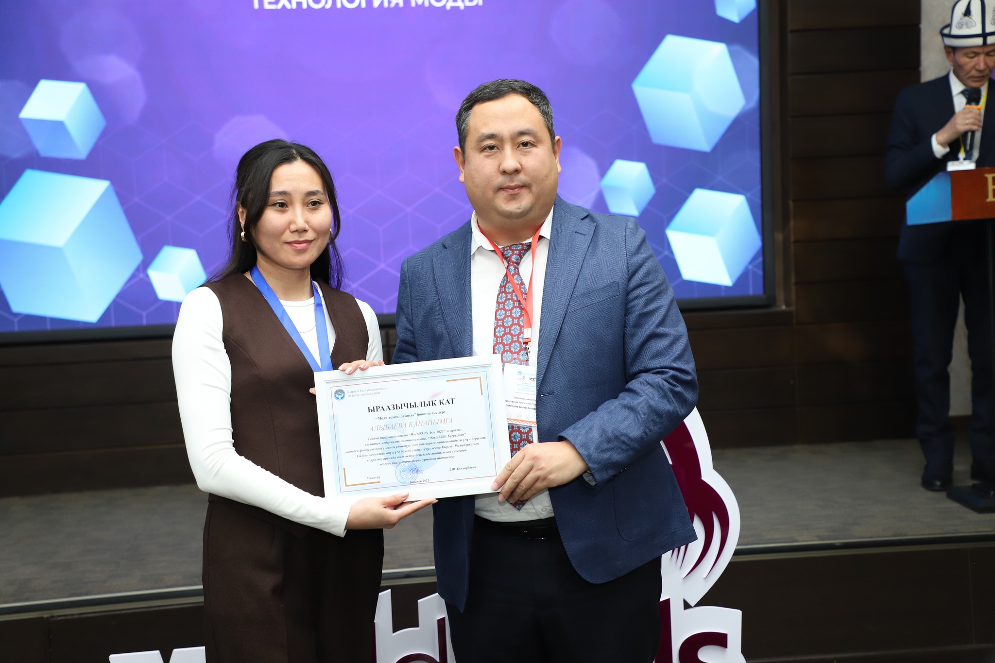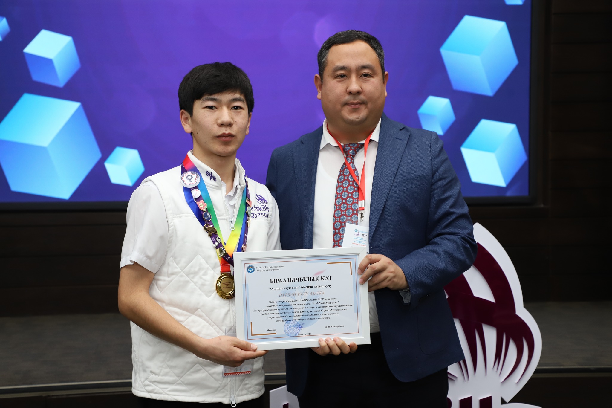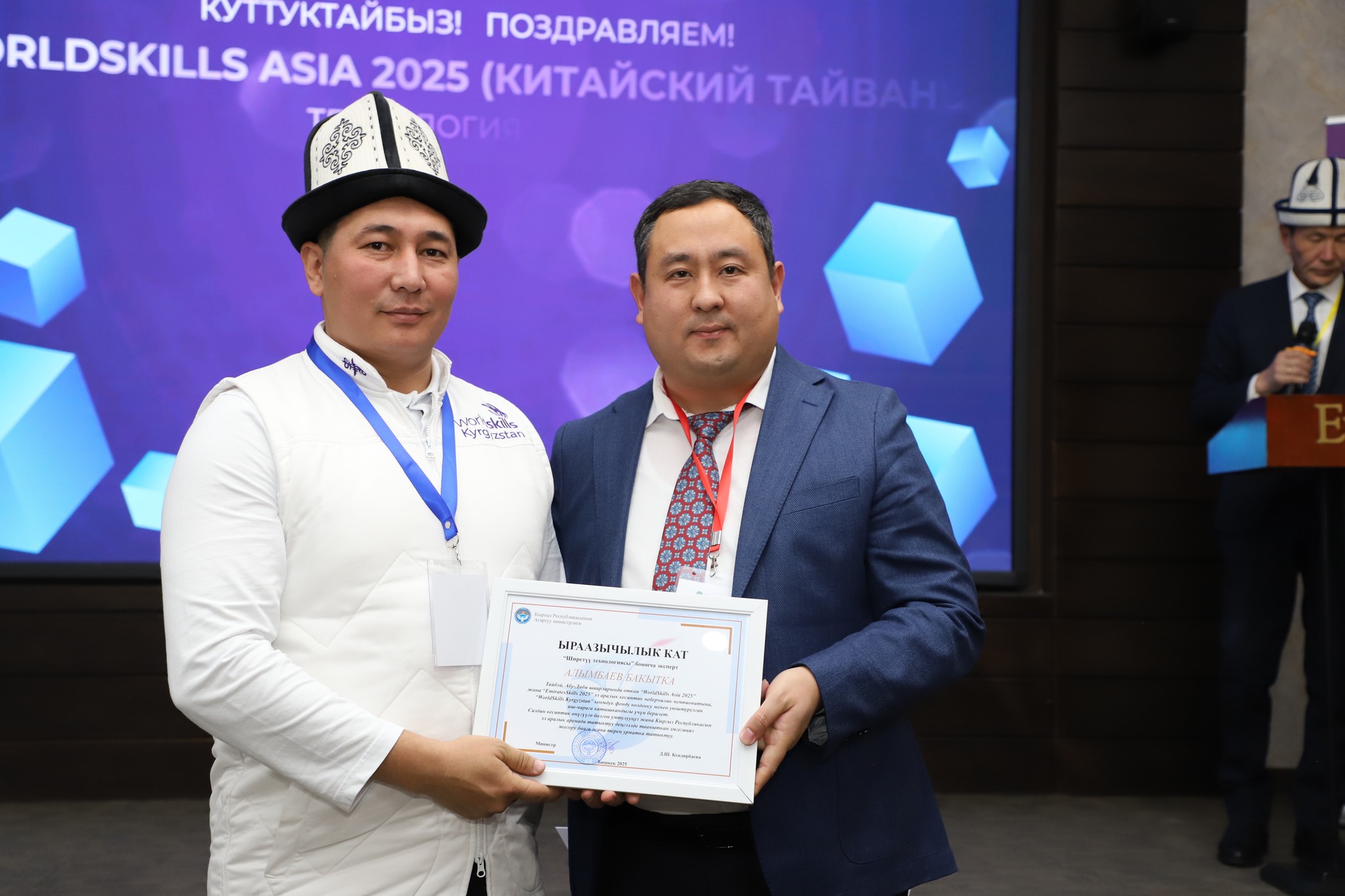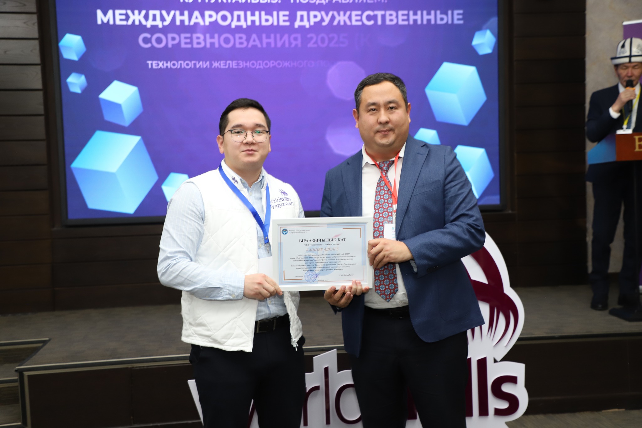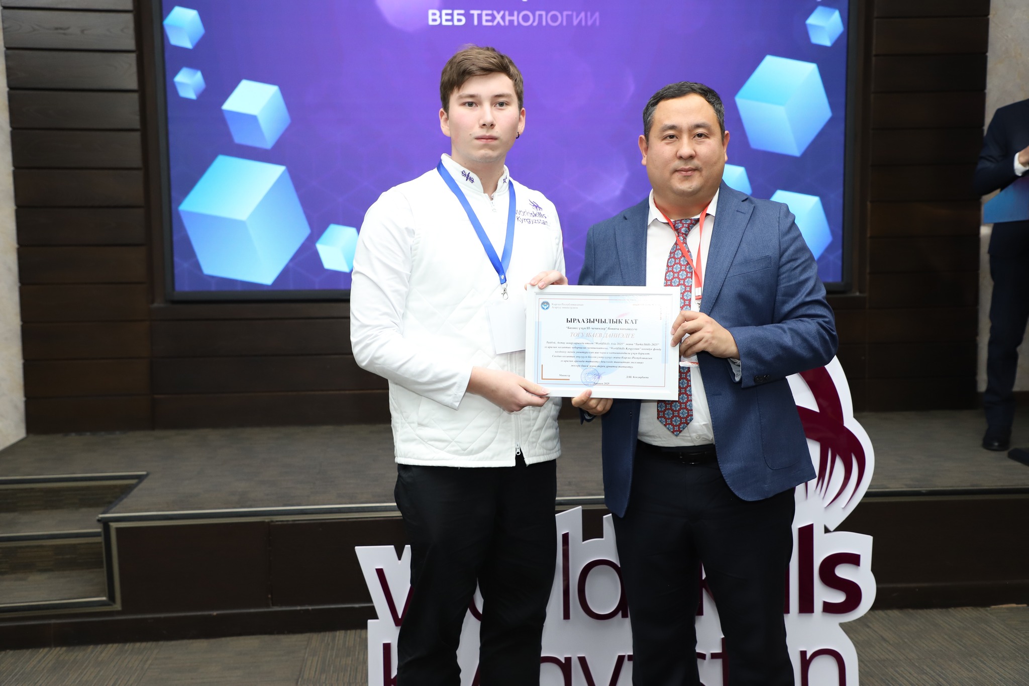 2025-жылдын 24-декабрында Бишкек шаарында жумушчу кесиптеринин үчүнчү улуттук «WorldSkills Kyrgyzstan» чемпионатынын салтанаттуу ачылыш аземи болуп өттү. Ачылыш аземде сөз сүйлөгөн Кыргыз Республикасынын Агартуу министринин орун басары Альберт Махметкулов быйыл кесиптик лицейлердин окуучулары бир катар эл аралык мелдештерге катышып, жогорку жетишкендиктерди көрсөткөнүн белгиледи. Анын айтымында, Тайбэй шаарында өткөн WorldSkills Asia Taipei 2025 эл аралык чемпионатында «Ширетүү технологиясы» компетенциясы боюнча №28 кыргыз-орус кесиптик лицейинин бүтүрүүчүсү Мавланбек Исманов Кыргызстанды татыктуу деңгээлде таанытып, «Best of Nation» наамын алган. Ошондой эле ал Кыргыз Республикасынын WorldSkills курама командасы алдыда Кытай Эл Республикасында өтө турган WorldSkills Shanghai 2026 эл аралык чемпионатына катыша турганын маалымдады. «Эл аралык кесиптик компетенциялык сынактарга катышуу бүгүнкү күндө кадрларды даярдоонун заманбап стандарттарын киргизүүгө, кесиптик көндүмдөрдү өнүктүрүүгө, эл аралык кызматташтыкты кеңейтүүгө жана жаштар арасында жумушчу кесиптерге болгон кызыгууну арттырууга өбөлгө түзөт», — деди Альберт Махметкулов. Мындан сырткары министрдин орун басары "WorldSkills Кыргызстан" коомдук фондуна, аталган кыймылды колдоп, кесиптик компетенцияларды өнүктүрүүгө көмөк көрсөткөн, мелдештерди уюштурган жана эл аралык аянтчаларга катышууга мүмкүнчүлүк түзгөн бардык өнөктөштөргө ыраазычылык билдирди. Иш-чаранын жүрүшүндө «WorldSkills» коомдук фондунун техникалык директору Максат Мамытов «WorldSkills Kyrgyzstan уюмунун 2025-жылдагы ишмердүүлүгүнүн жыйынтыктары — негизги жетишкендиктер, эл аралык катышуулар, компетенциялардын жана өнөктөштүктүн өнүгүүсү» темасында презентация жасады. Андан сырткары, Тайбей шаарында өткөн «WorldSkills Asia 2025», Актау шаарындагы «TurkicSkills 2025», Абу-Дабидеги «EmiratesSkills 2025» чемпионаттарынын катышуучуларына, окутуучуларына жана өнөктөштөрүнө ыраазычылык каттары тапшырылды.