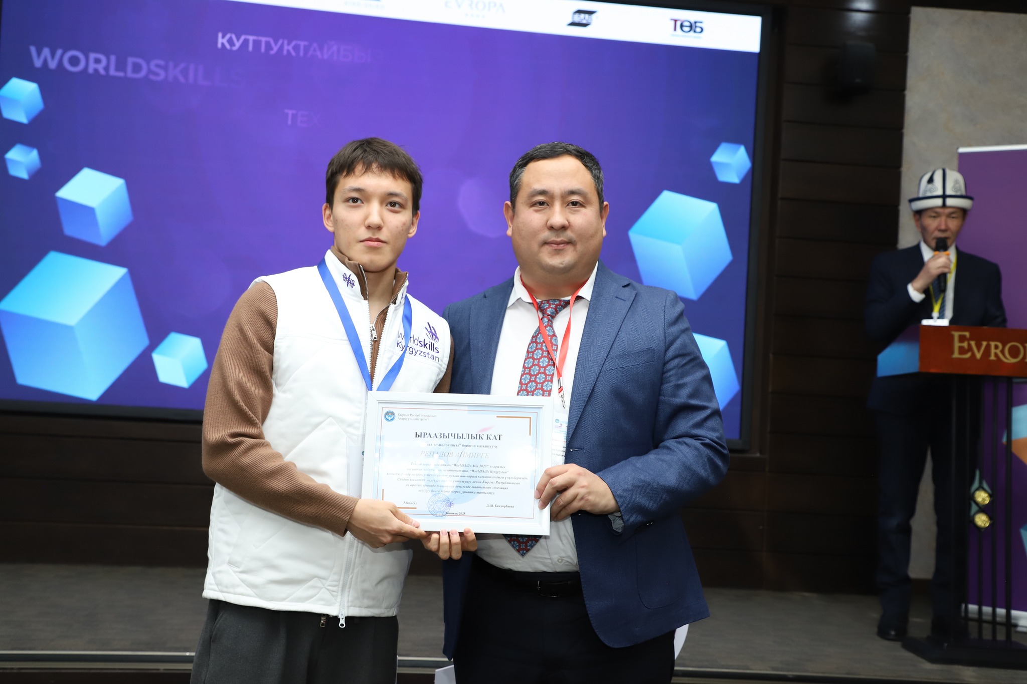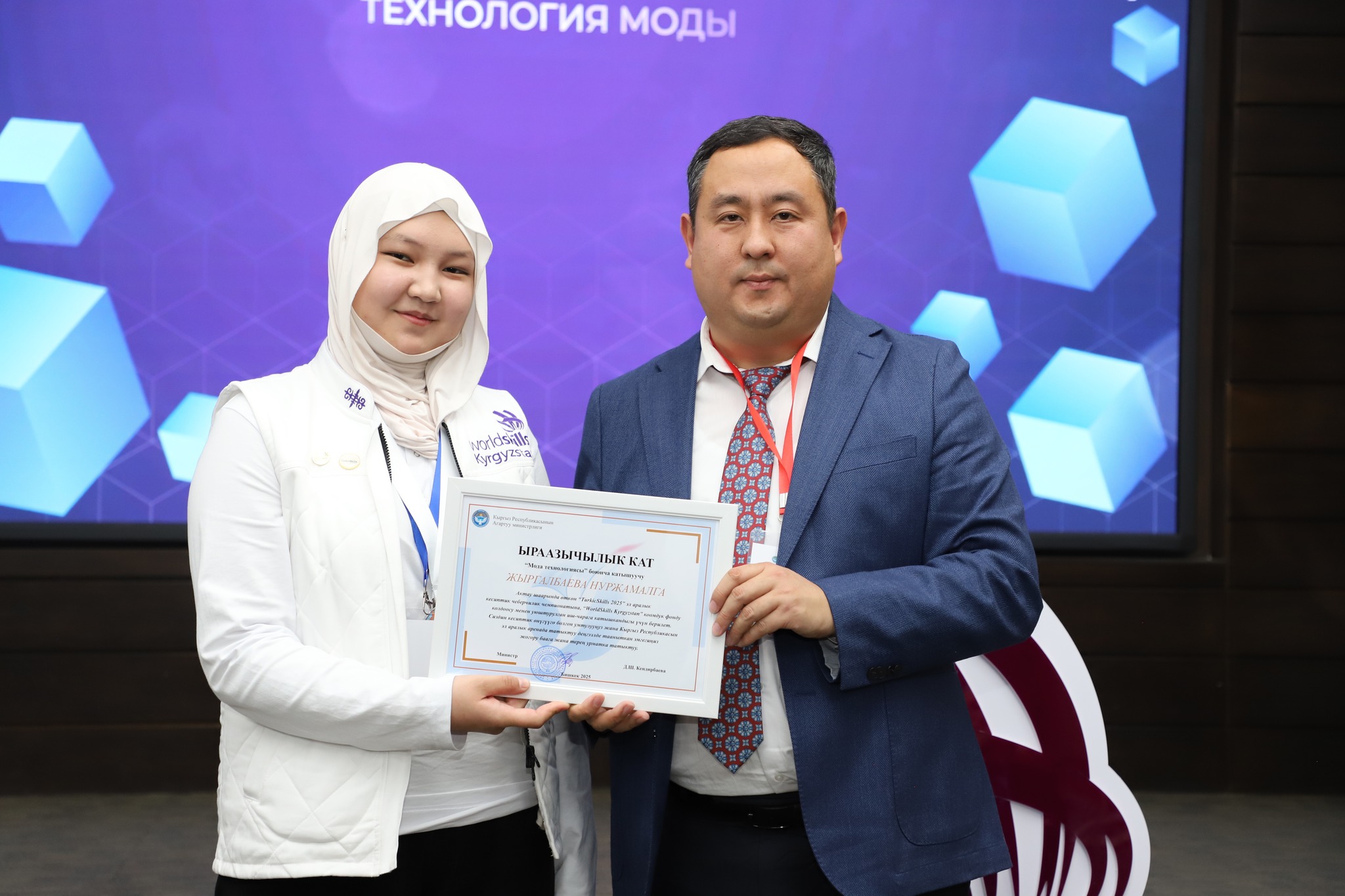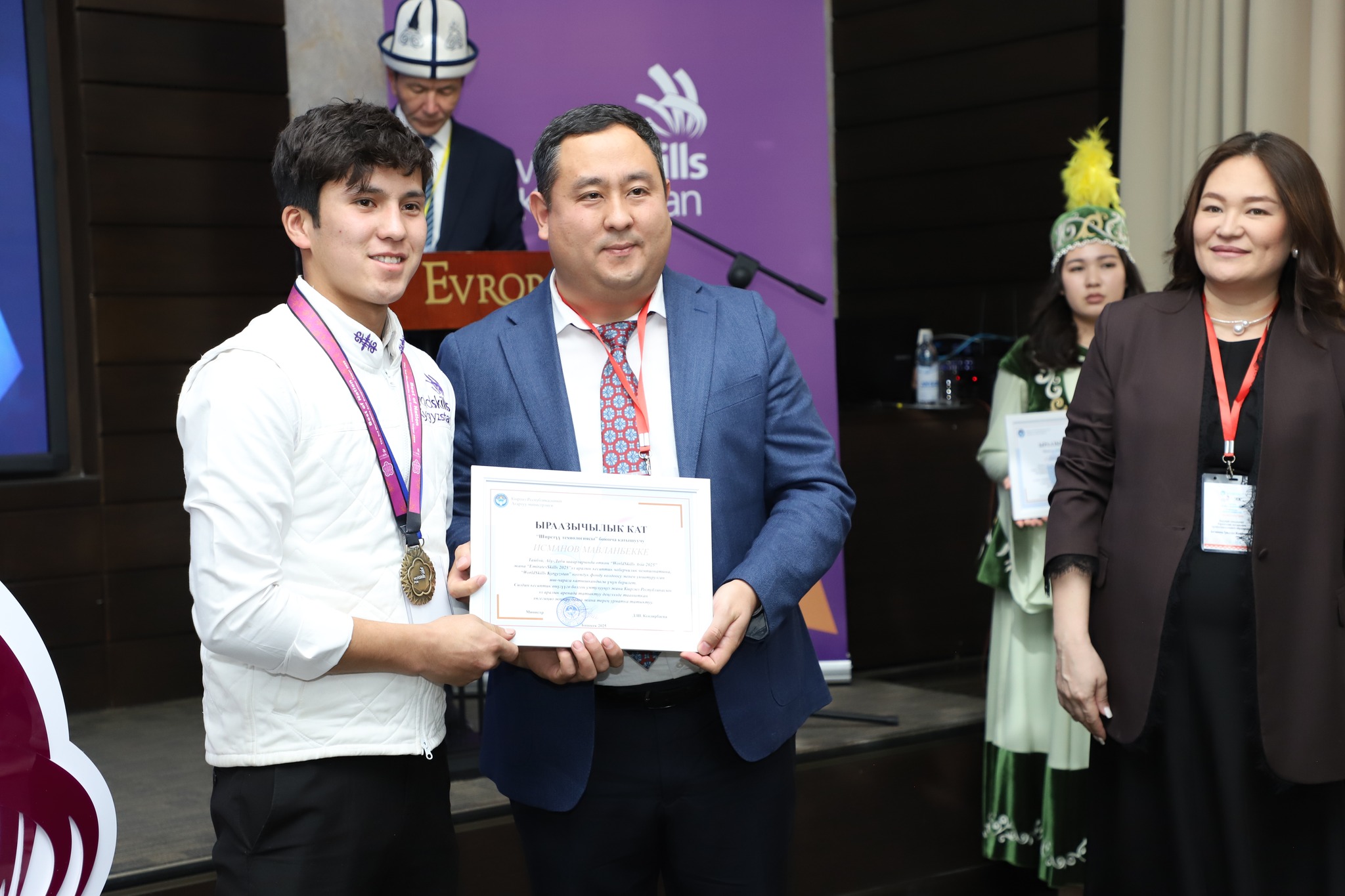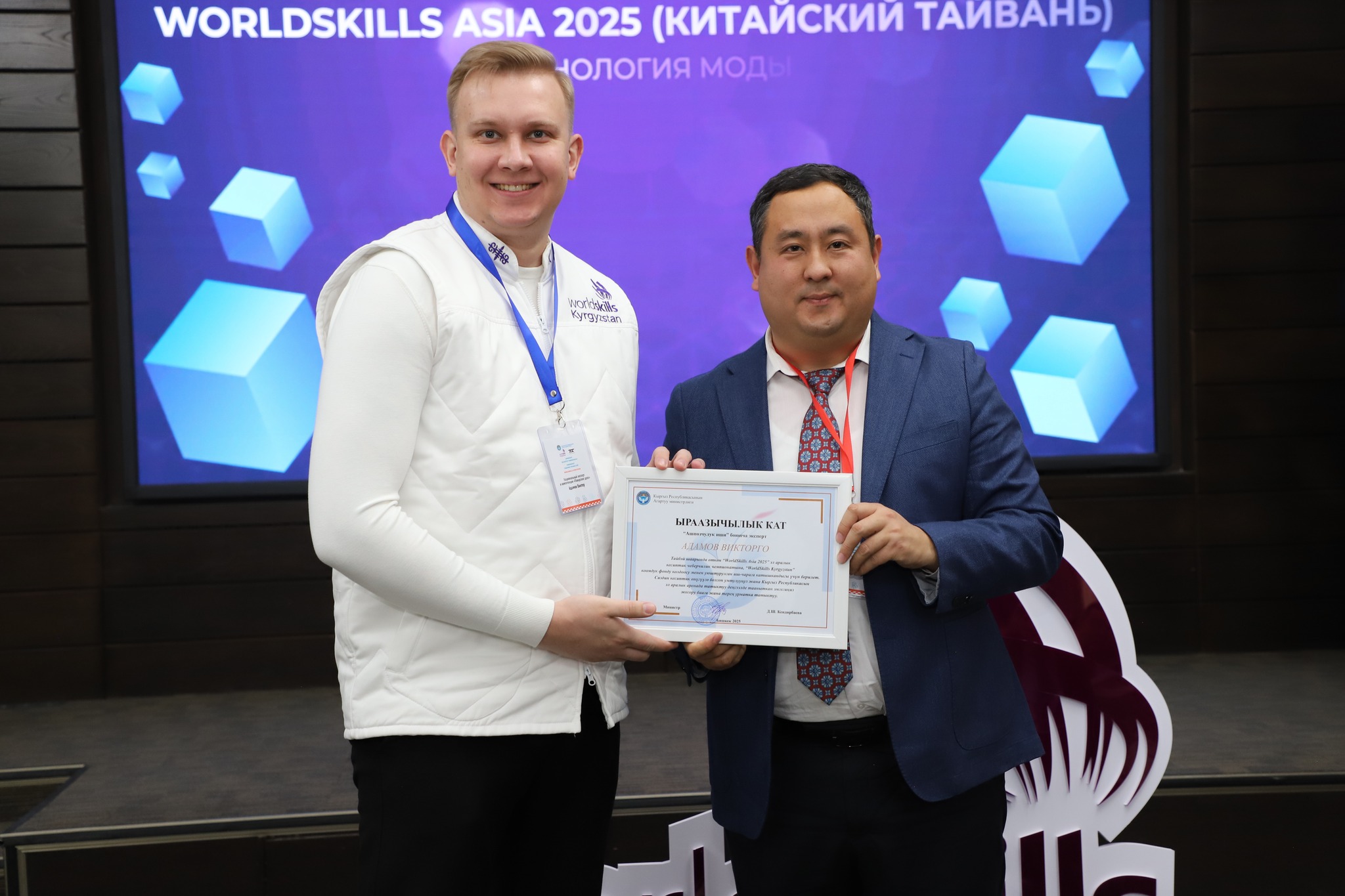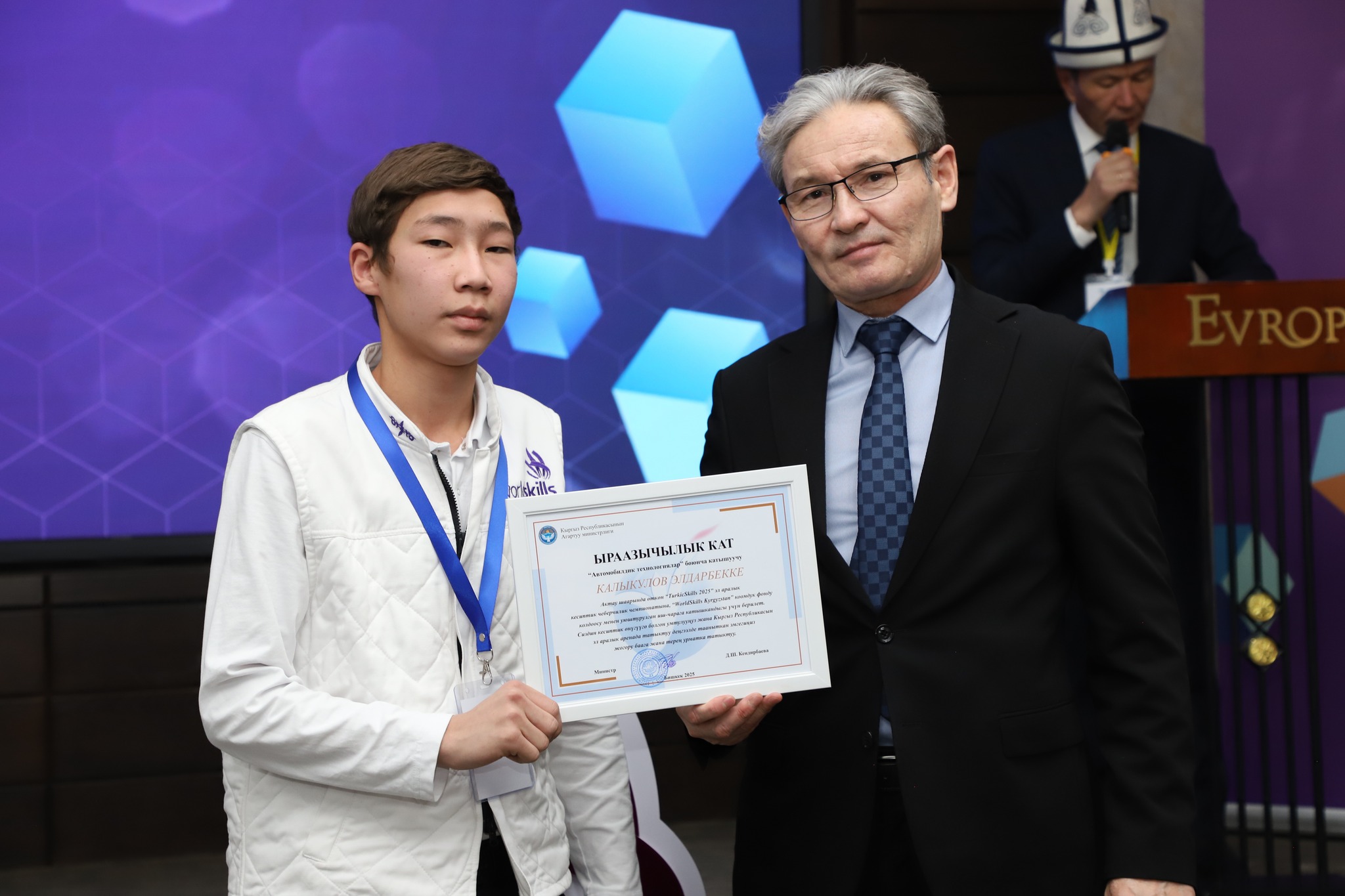 2025-жылдын 24-декабрында Бишкек шаарында жумушчу кесиптеринин үчүнчү улуттук «WorldSkills Kyrgyzstan» чемпионатынын салтанаттуу ачылыш аземи болуп өттү. Ачылыш аземде сөз сүйлөгөн Кыргыз Республикасынын Агартуу министринин орун басары Альберт Махметкулов быйыл кесиптик лицейлердин окуучулары бир катар эл аралык мелдештерге катышып, жогорку жетишкендиктерди көрсөткөнүн белгиледи. Анын айтымында, Тайбэй шаарында өткөн WorldSkills Asia Taipei 2025 эл аралык чемпионатында «Ширетүү технологиясы» компетенциясы боюнча №28 кыргыз-орус кесиптик лицейинин бүтүрүүчүсү Мавланбек Исманов Кыргызстанды татыктуу деңгээлде таанытып, «Best of Nation» наамын алган. Ошондой эле ал Кыргыз Республикасынын WorldSkills курама командасы алдыда Кытай Эл Республикасында өтө турган WorldSkills Shanghai 2026 эл аралык чемпионатына катыша турганын маалымдады. «Эл аралык кесиптик компетенциялык сынактарга катышуу бүгүнкү күндө кадрларды даярдоонун заманбап стандарттарын киргизүүгө, кесиптик көндүмдөрдү өнүктүрүүгө, эл аралык кызматташтыкты кеңейтүүгө жана жаштар арасында жумушчу кесиптерге болгон кызыгууну арттырууга өбөлгө түзөт», — деди Альберт Махметкулов. Мындан сырткары министрдин орун басары "WorldSkills Кыргызстан" коомдук фондуна, аталган кыймылды колдоп, кесиптик компетенцияларды өнүктүрүүгө көмөк көрсөткөн, мелдештерди уюштурган жана эл аралык аянтчаларга катышууга мүмкүнчүлүк түзгөн бардык өнөктөштөргө ыраазычылык билдирди. Иш-чаранын жүрүшүндө «WorldSkills» коомдук фондунун техникалык директору Максат Мамытов «WorldSkills Kyrgyzstan уюмунун 2025-жылдагы ишмердүүлүгүнүн жыйынтыктары — негизги жетишкендиктер, эл аралык катышуулар, компетенциялардын жана өнөктөштүктүн өнүгүүсү» темасында презентация жасады. Андан сырткары, Тайбей шаарында өткөн «WorldSkills Asia 2025», Актау шаарындагы «TurkicSkills 2025», Абу-Дабидеги «EmiratesSkills 2025» чемпионаттарынын катышуучуларына, окутуучуларына жана өнөктөштөрүнө ыраазычылык каттары тапшырылды.