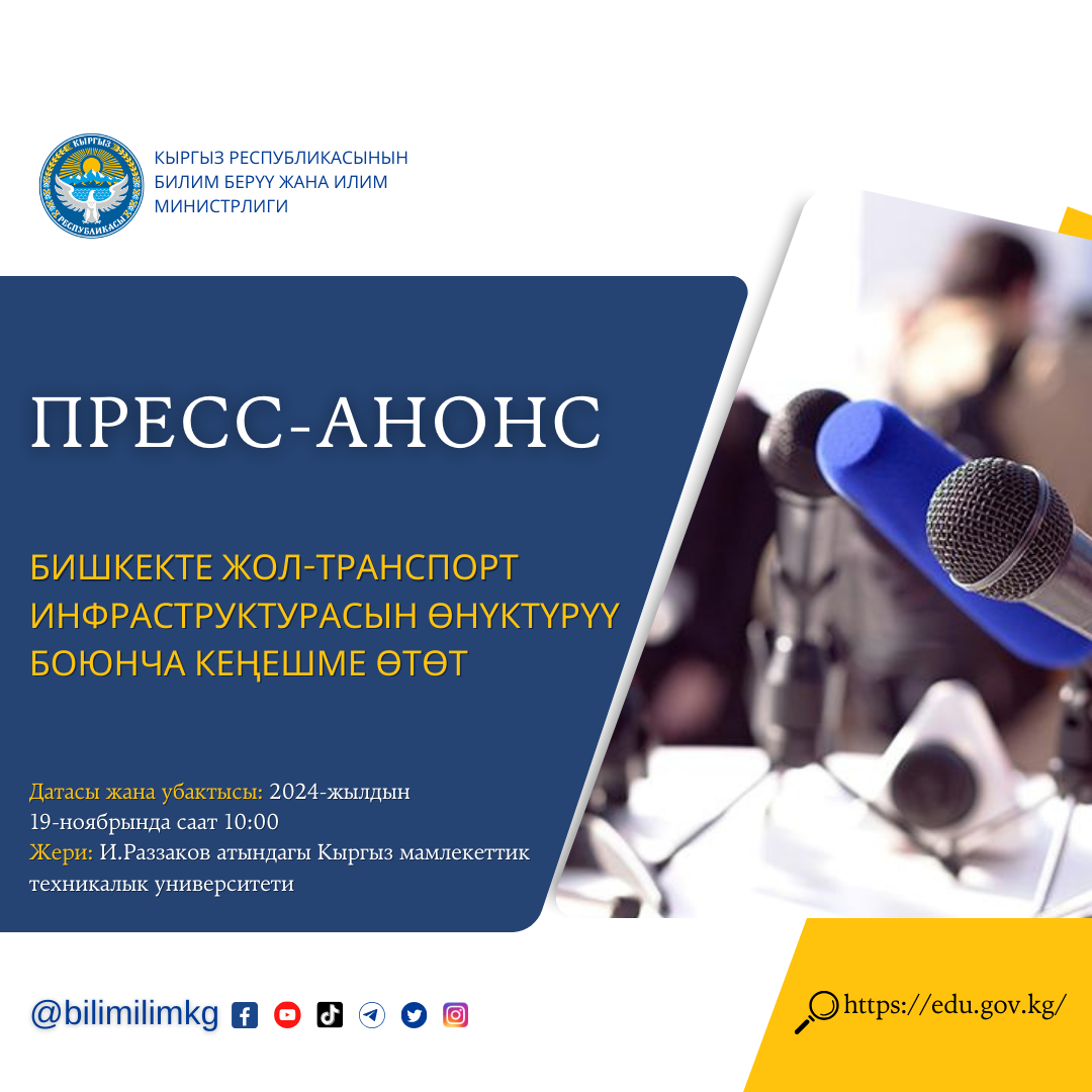 2024-жылдын 19-ноябрында И. Раззаков атындагы Кыргыз мамлекеттик техникалык университетинде Бишкек шаарынын мэриясы менен жол-транспорт инфраструктурасын өнүктүрүү боюнча кеңешме өткөрүлөт.
