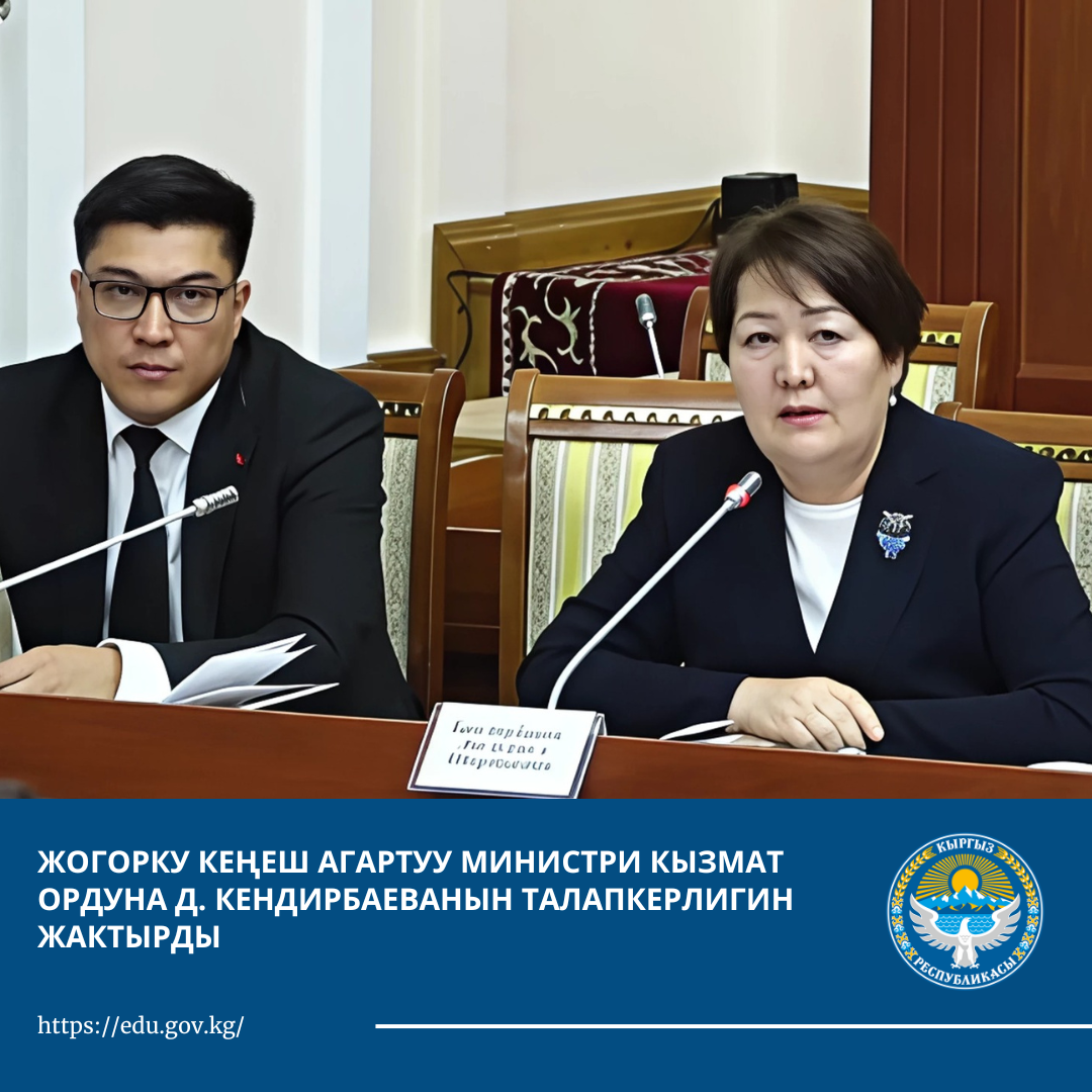 Бүгүн, 14-майда, Кыргыз Республикасынын Жогорку Кеңешинин жыйынында өлкөнүн агартуу министринин милдетин аткаруучу Д. Кендирбаева менен илим, жогорку билим берүү жана инновациялар министринин милдетин аткаруучу Б. Орозовдун талапкерлиги каралды.