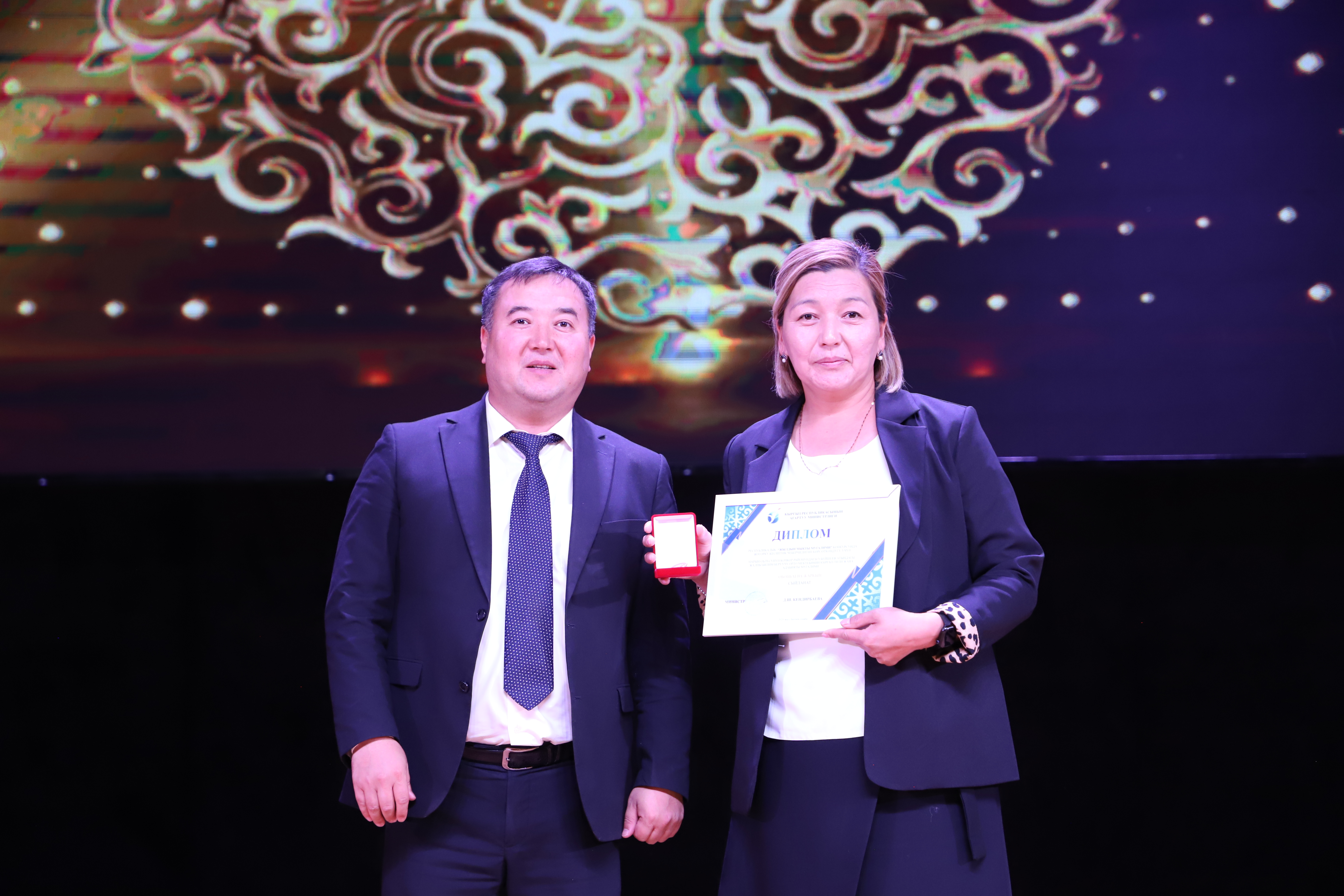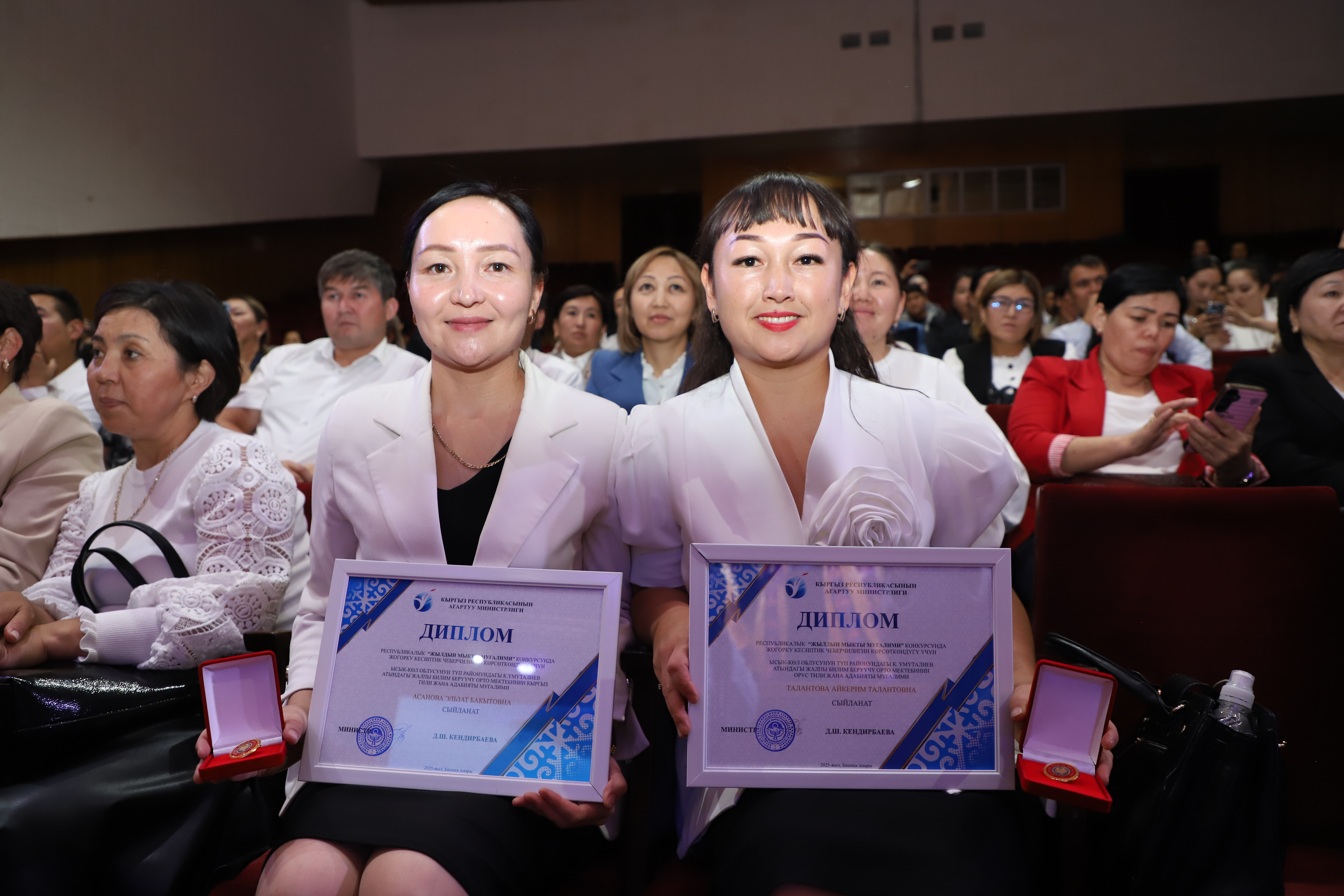 «Жылдын мыкты мугалими» конкурсуна жогорку кесиптик чеберчилигин көрсөткөндүгү үчүн диплом жана төш белгилерди Кыргыз Республикасынын Агартуу министринин биринчи орун басары Мухтарбек Баймурзаев тапшырды.